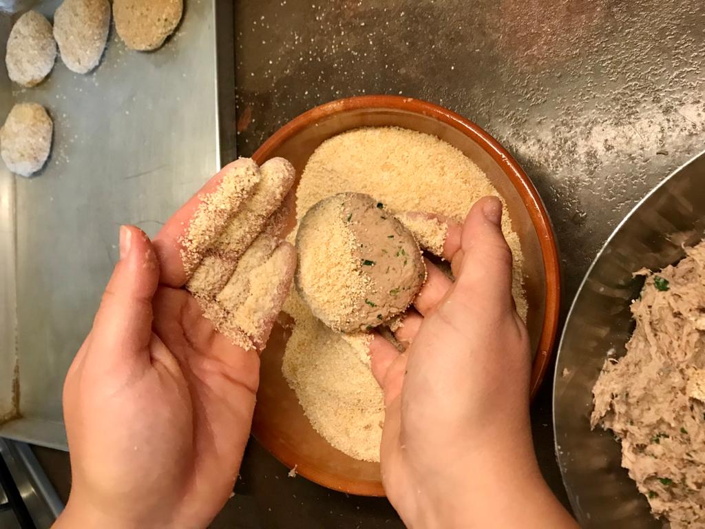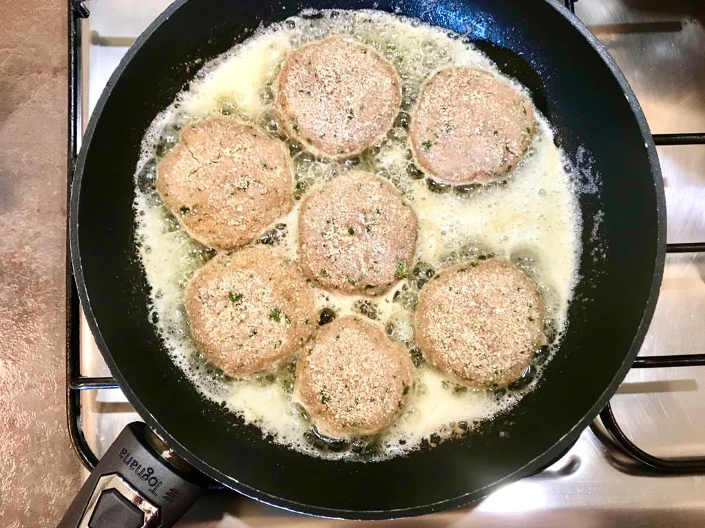 Creare dei medaglioni e passarli nel pan grattato per poi friggerli nel burro.