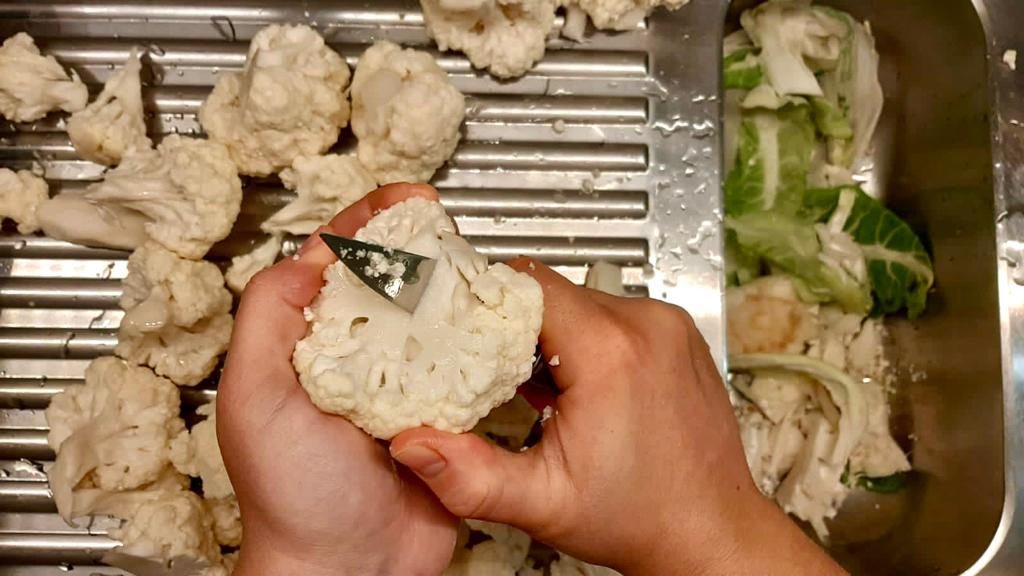 In una pentola mettere a bollire l’acqua con la curcuma e il sale. Aggiungere il cavolfiore e sbollentarlo per 5 minuti.