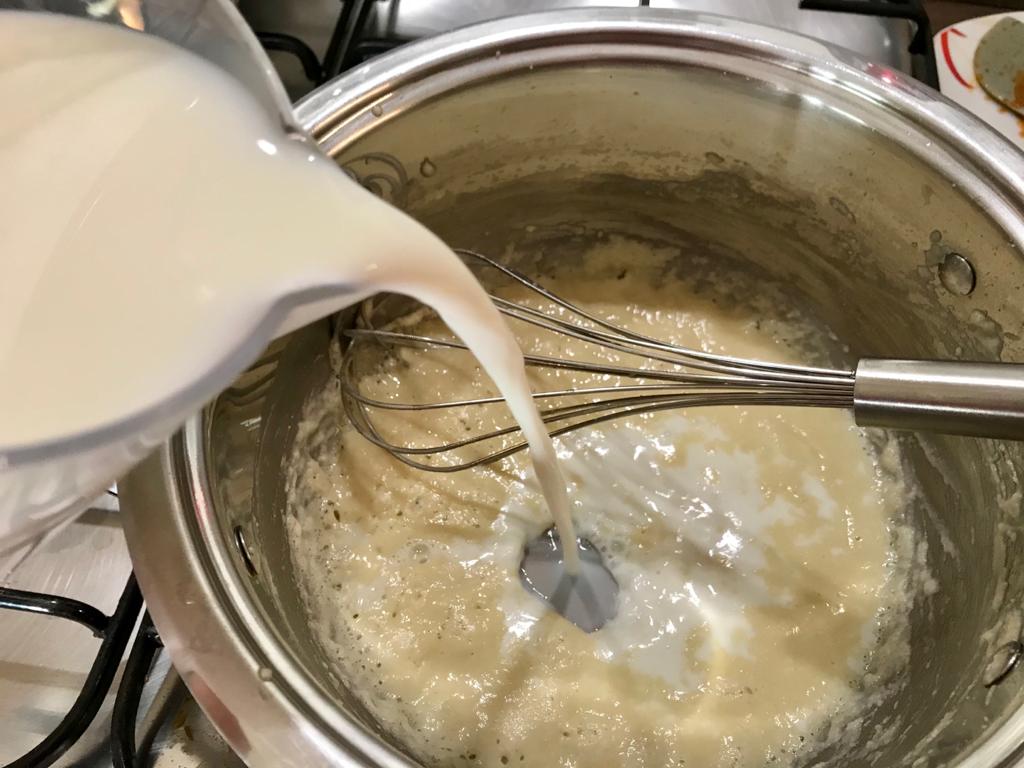 Prepariamo la besciamella mettendo a sciogliere il burro in una pentola, una volta sciolto versare tutto d’un colpo la farina e farla tostare qualche minuto smuovendola con una frusta.