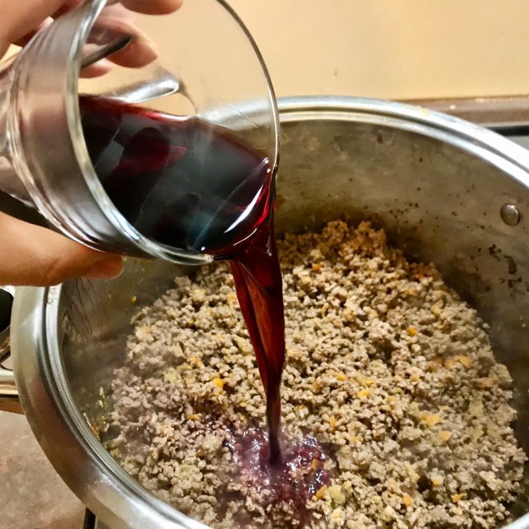 Aggiungere la carne trita e farla rosolare bene, sfumare con il vino e lasciarlo evaporare.