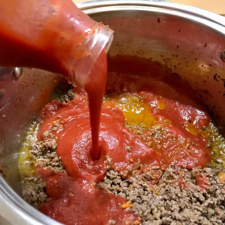 Aggiungere ora la passata di pomodoro, sciacquare le bottiglie con acqua e versare anche quella nella pentola. Aggiungere un bel pizzico di sale.