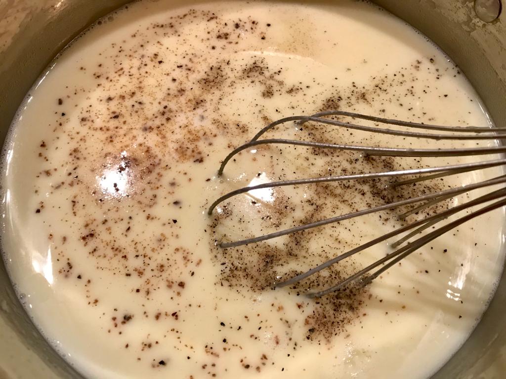 Aggiungere il latte riscaldato, il sale, il pepe e la noce moscata e portare a bollore continuando a girare, spegnere quando si otterrà una consistenza cremosa non troppo solida.