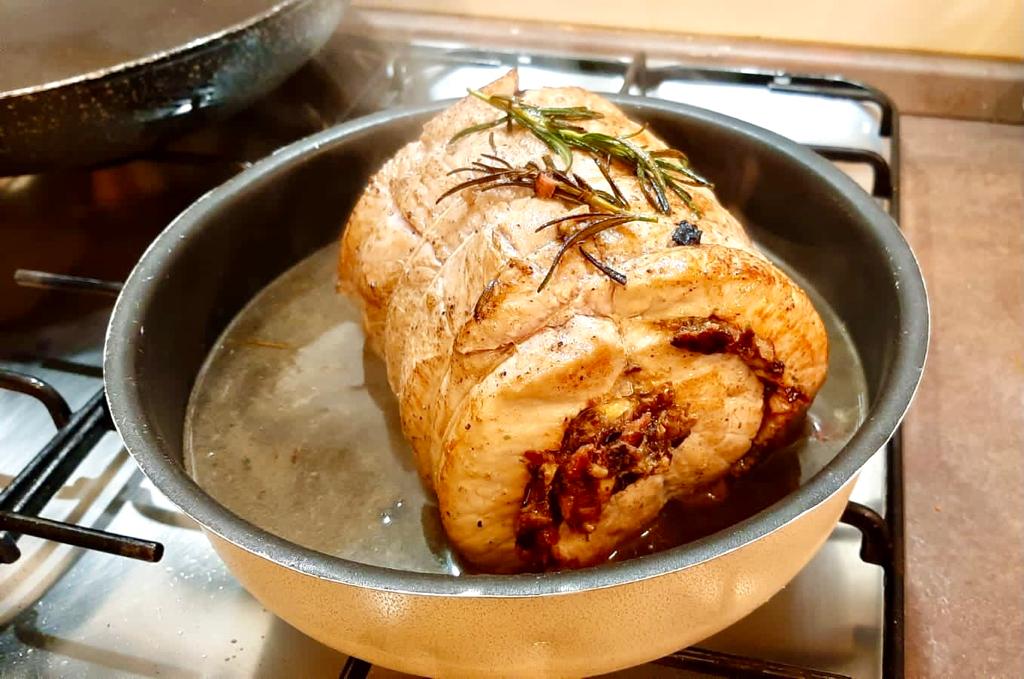 A questo punto trasferirla in una teglia con il fondo di cottura, aggiungere un bicchiere abbondante di brodo e finirla di cuocere in forno a 180 gradi per circa un’ora.