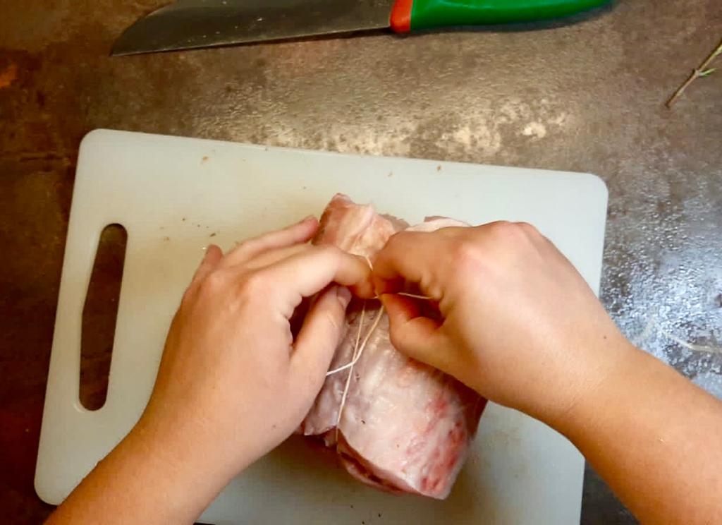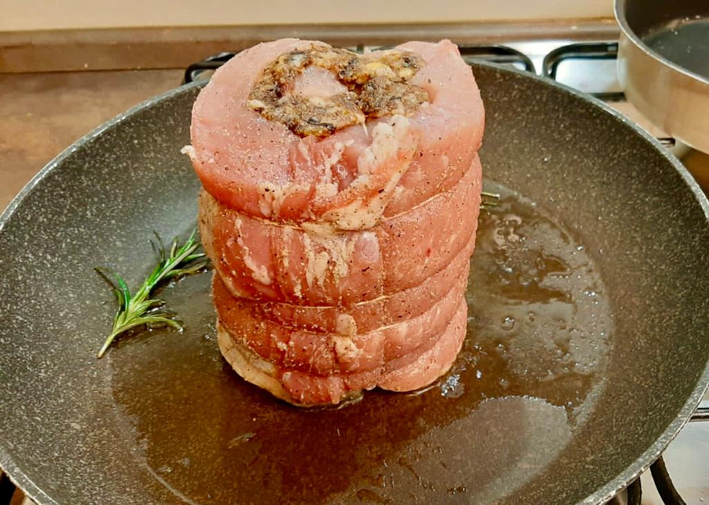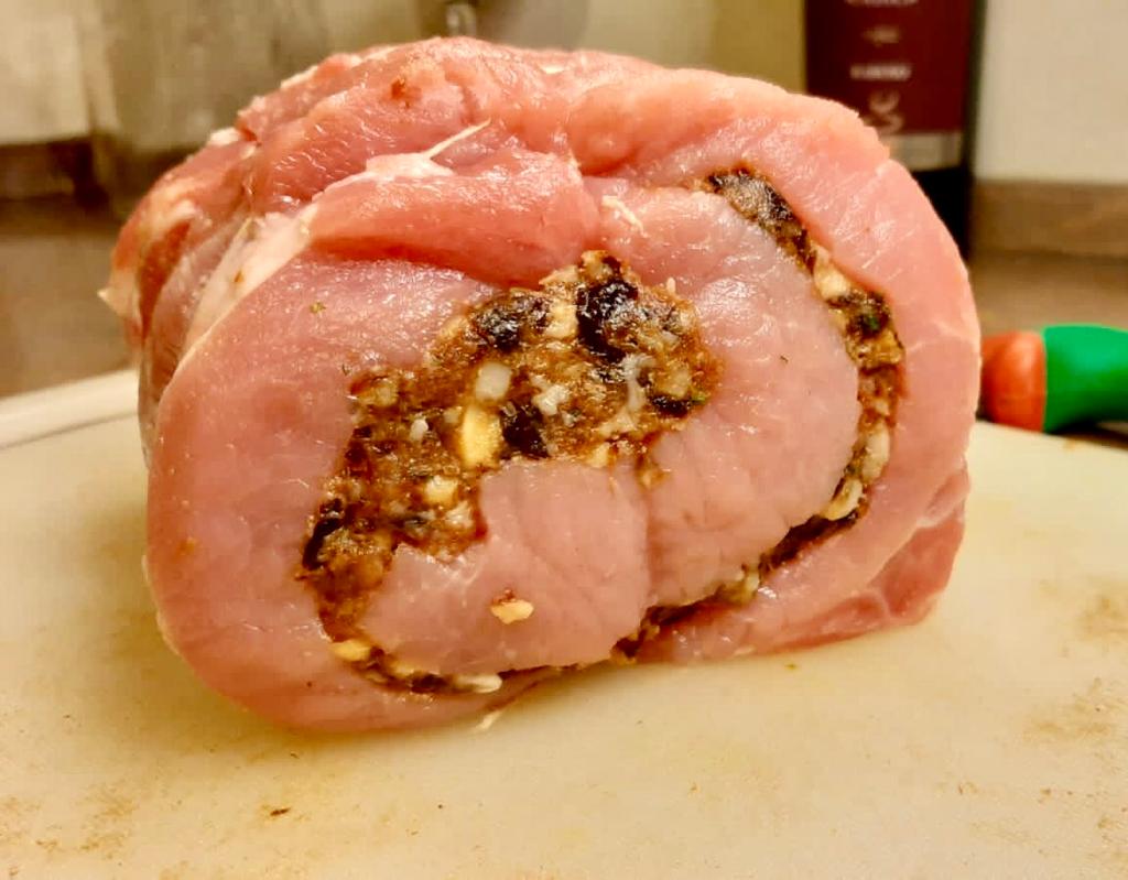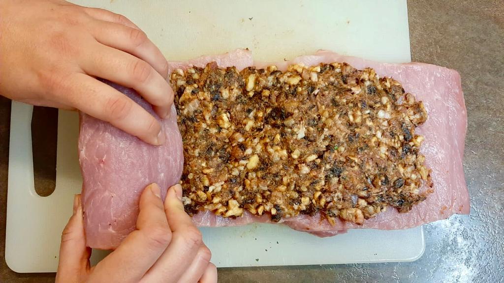 Spalmare questo composto su tutta la fetta di carne e arrotolarla legandola bene con lo spago da cucina.