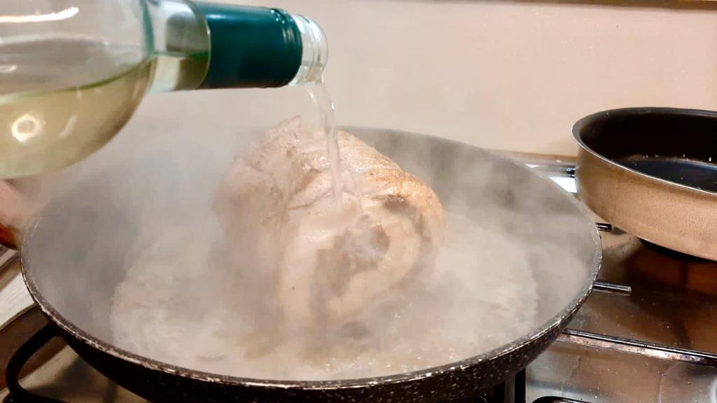 In una padella far rosolare uno spicchio d’aglio e un rametto di rosmarino, aggiungere la carne e farla sigillare bene da tutti i lati, sfumarla con un bicchiere di vino bianco.