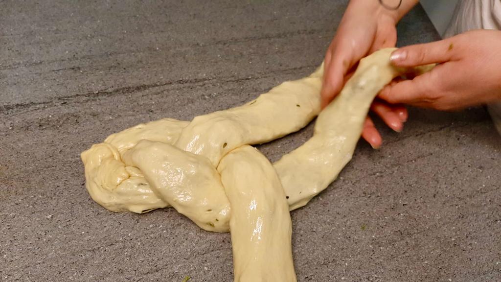 Unire i tre cilindri a una delle due estremità e iniziare a creare la treccia fino a chiudere l’altro estremo.