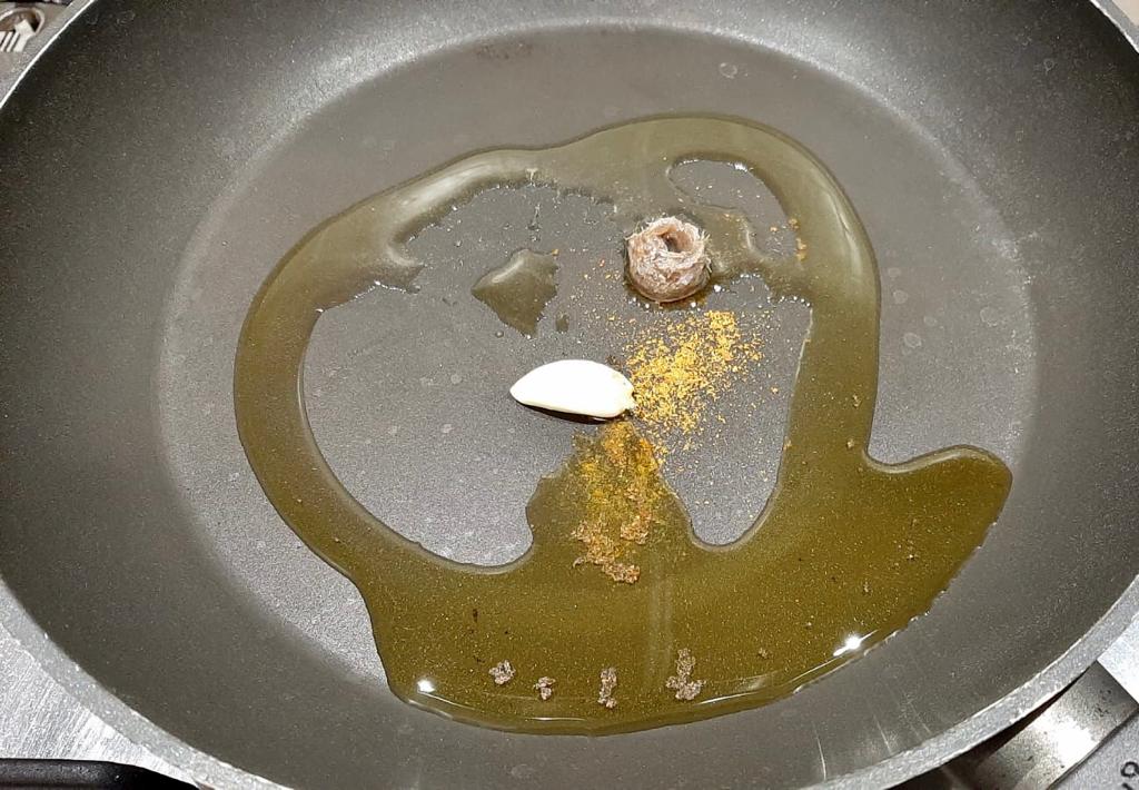 In una padella soffriggere il classico aglio, olio e peperoncino con l’aggiunta, se vi piace, delle acciughe sott’olio.