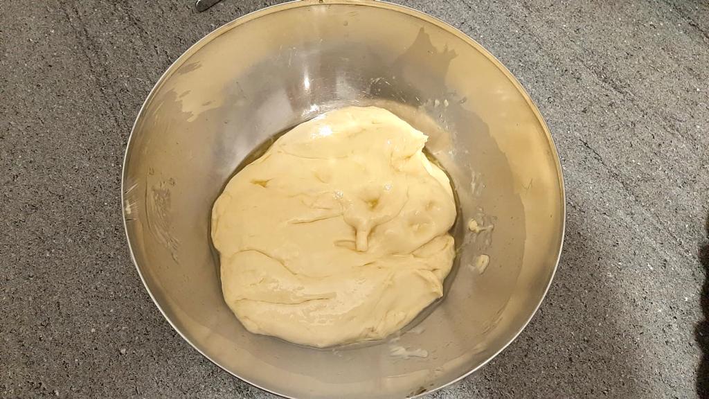 Far lievitare l’impasto in una ciotola unta di olio fino al raddoppio. Io vi consiglio di coprirlo con della pellicola e riporlo nel forno spento con luce accesa.