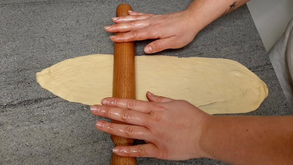 Creare dei cilindri e con l’aiuto di un mattarello stenderli in tre rettangoli uguali.