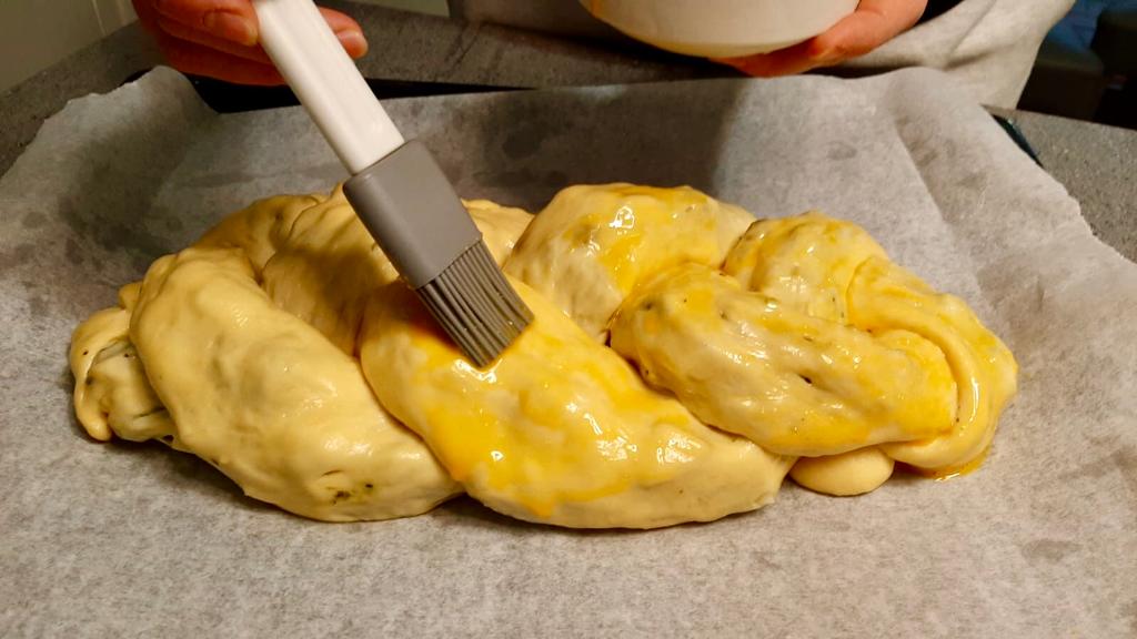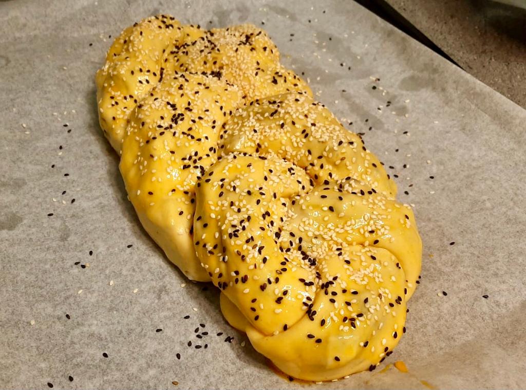 Spennellare la treccia con un uovo sbattuto e cospargerla di semi di sesamo.