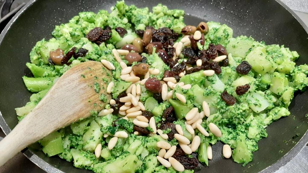 Rimuovere l’aglio e aggiungere i broccoli, le olive taggiasche, i pinoli tostati e l’uvetta.