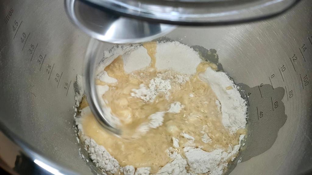 Sciogliere il lievito nel latte, aggiungere l’olio, lo zucchero e l’uovo. Miscelare bene e versare tutto in planetaria. Aggiungere metà farina e iniziare a impastare, quando gli ingredienti inizieranno ad essere un composto aggiungere la restante farina e per ultimo il sale.
