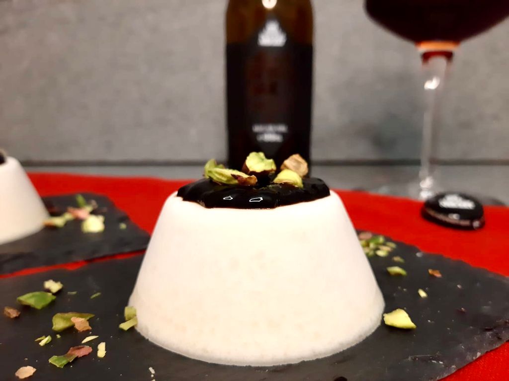 È una birra molto complessa e sicuramente non per tutti, il contributo lattico e acetico è impegnativo ma sicuramente in linea con il gelèe di aceto balsamico che ricopre questa pannacotta. Una volta superata la difficoltà di questi sapori forti, si apre un mondo di gusti inaspettati per una birra.