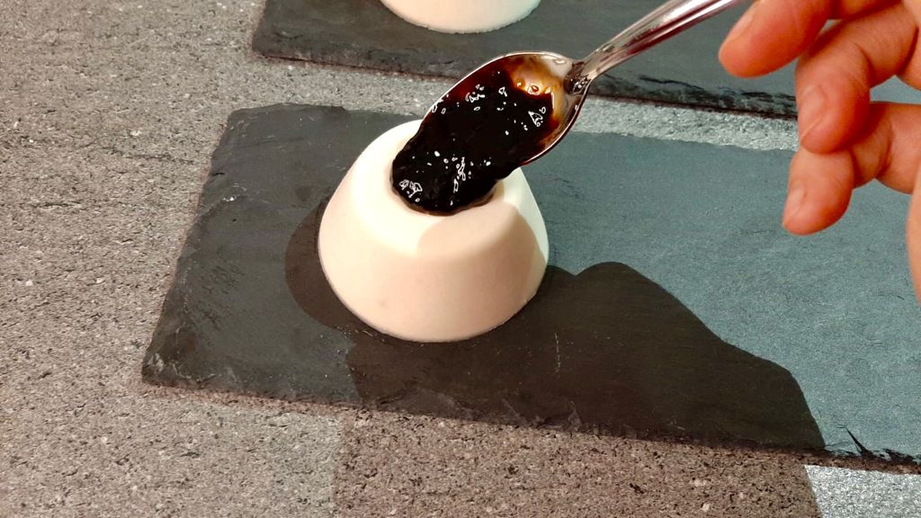 Una volta che la panna sarà rappresa, sformarla e adagiarla sul piatto da portata (ci vorrà circa un’ora perchè si scongeli), smuovere un po’ la gelatina di aceto balsamico e aggiungerla sopra la panna cotta.