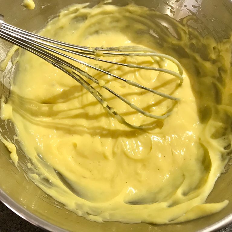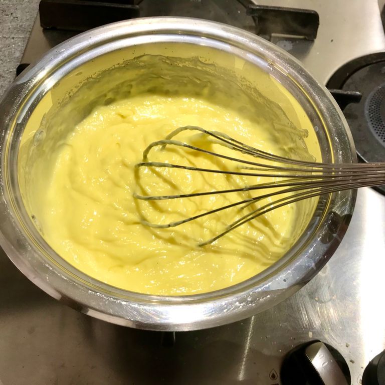 Quando la crema si sarà addensata versarla nella ciotola fredda da frigo e sbattere con la frusta in modo che si raffreddi velocemente e che diventi liscia e lucida.