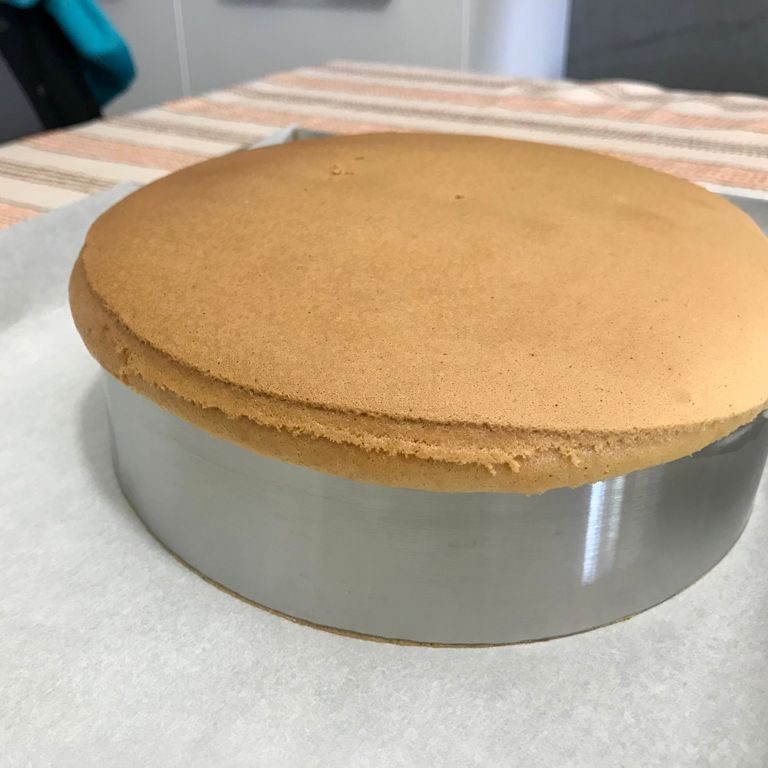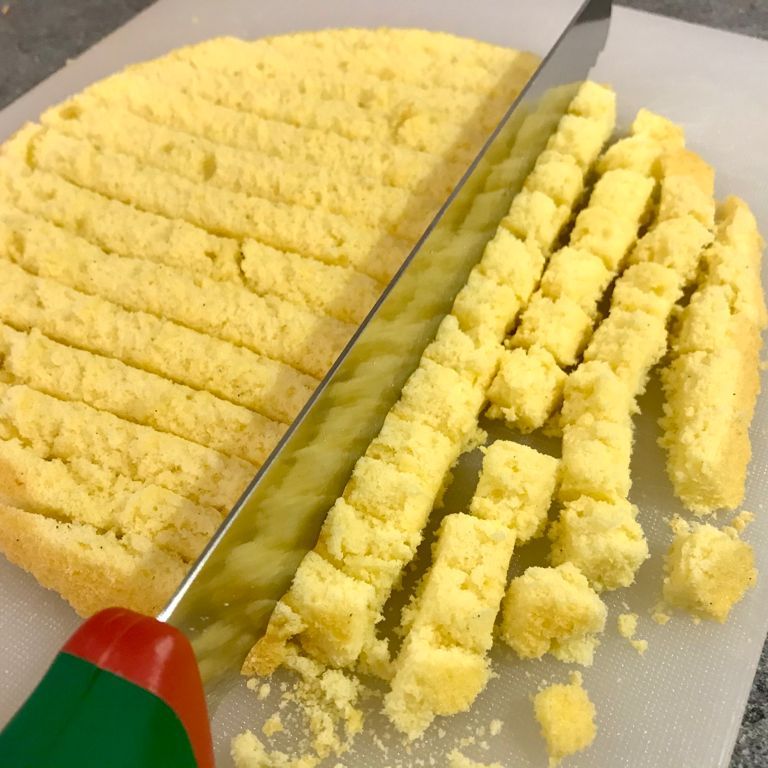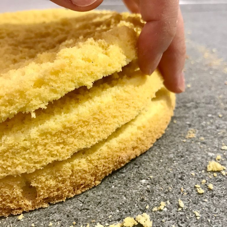 Una volta che il pan di spagna è freddo “sbucciarlo” togliendo quella pellicina che si sarà creata in superficie e tagliarlo in 3 dischi, prendere il disco centrale e tagliarlo a cubetti.