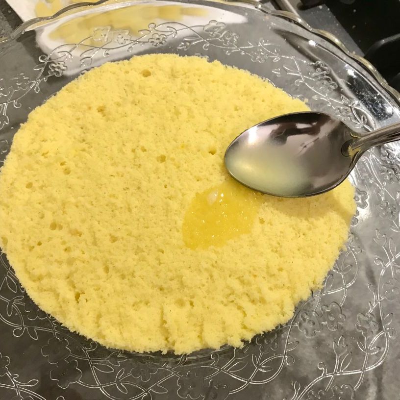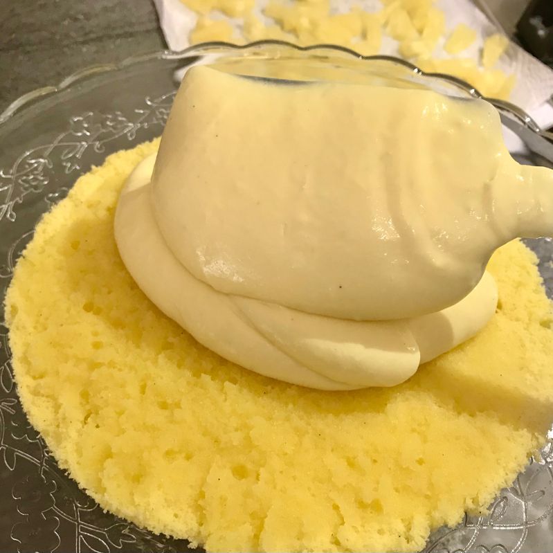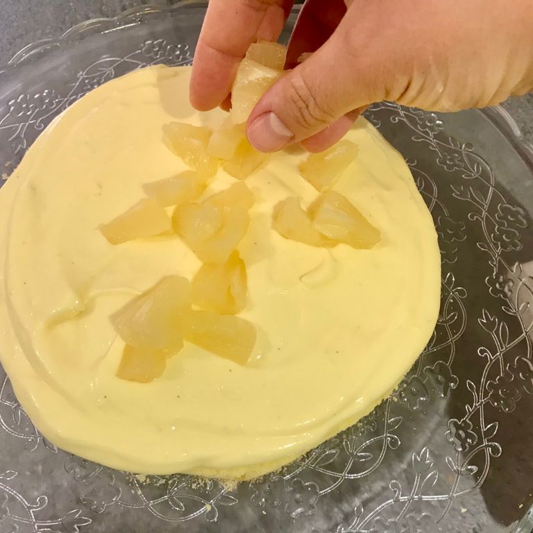 Mettere un disco di pan di spagna sul piatto da portata, bagnarlo con lo sciroppo dell’ananas, creare uno strato generoso di crema diplomatica e aggiungere l’ananas in pezzi. Coprire con il secondo strato di pan di spagna.