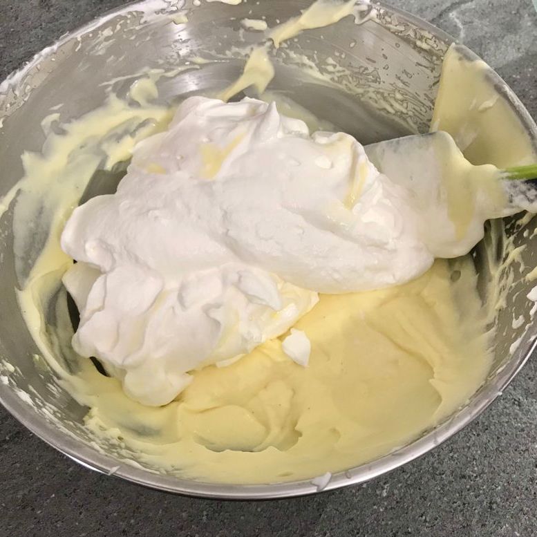 Bisogna semi montare 500 ml di panna e versarne la metà nella crema pasticcera fredda.
