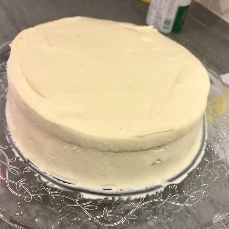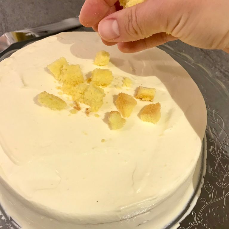 Unire la panna montata che avevamo tenuto da parte alla crema diplomatica e ricoprire totalmente la torta.