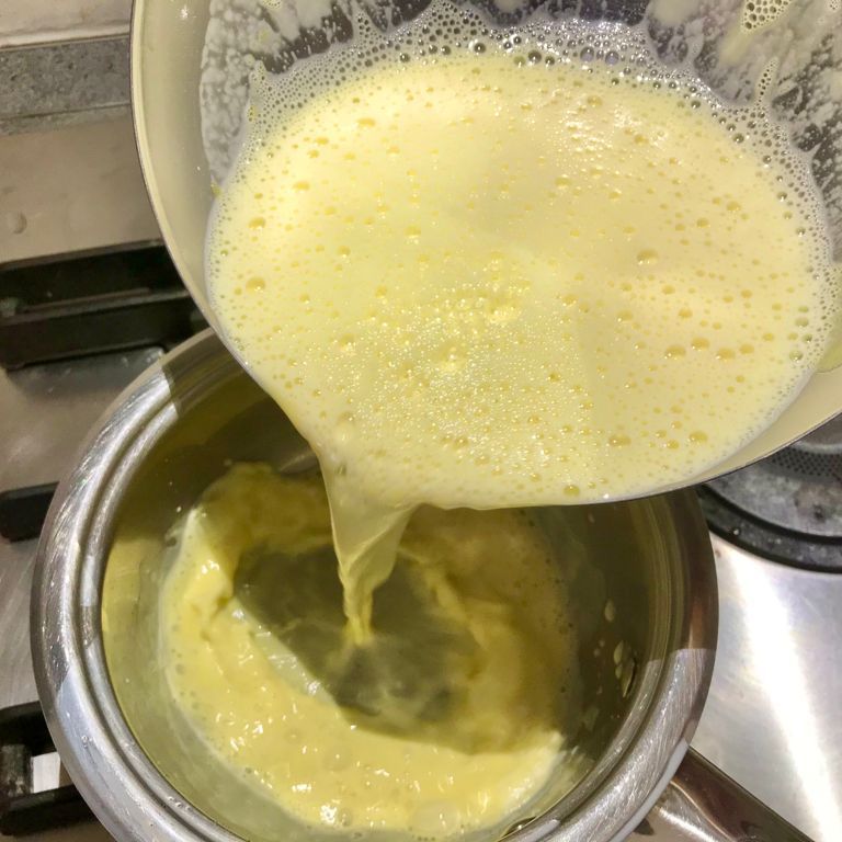 Versare ora tutto il composto nel pentolino dove abbiamo scaldato il latte e rimettere sul fuoco.