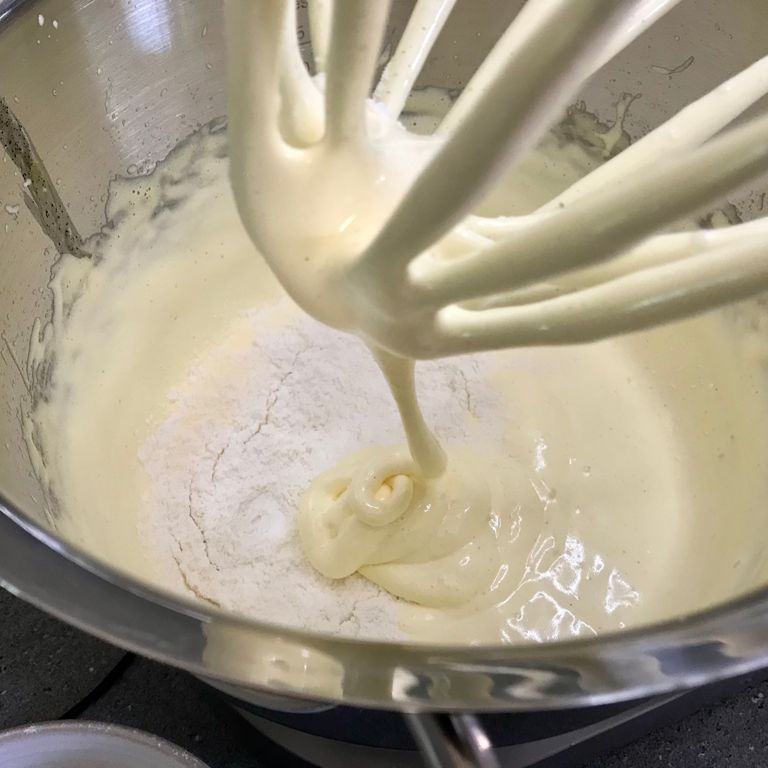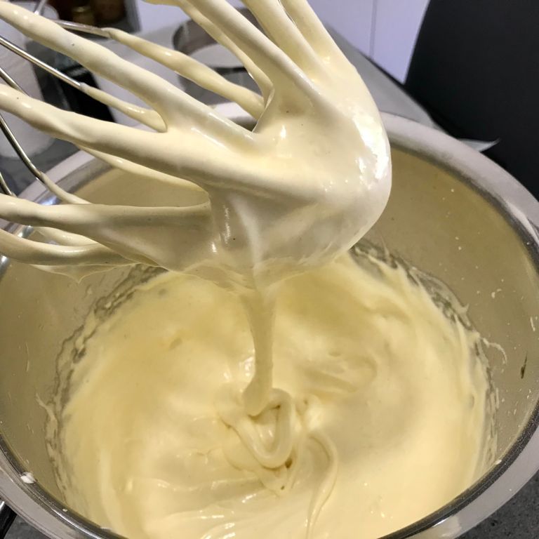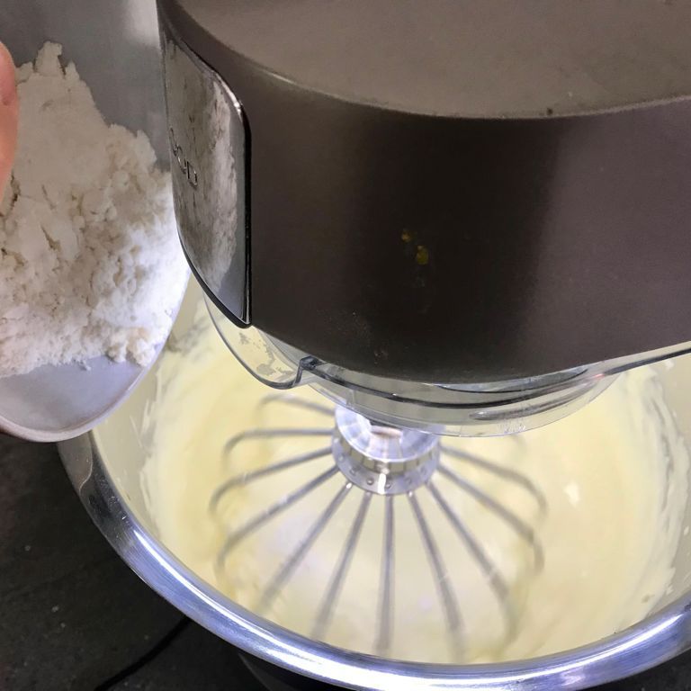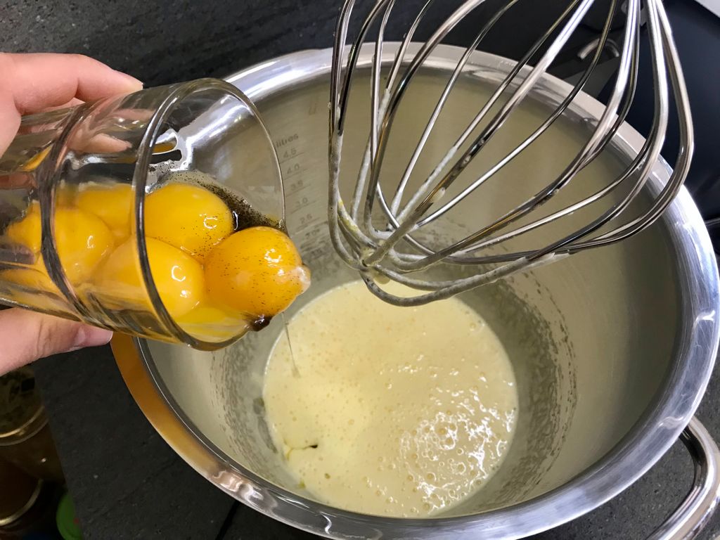 Diminuire la velocità della planetaria, aggiungere i tuorli con la scorza di limone e la vaniglia, alzare la velocità al massimo e far montare per 13-15 minuti.