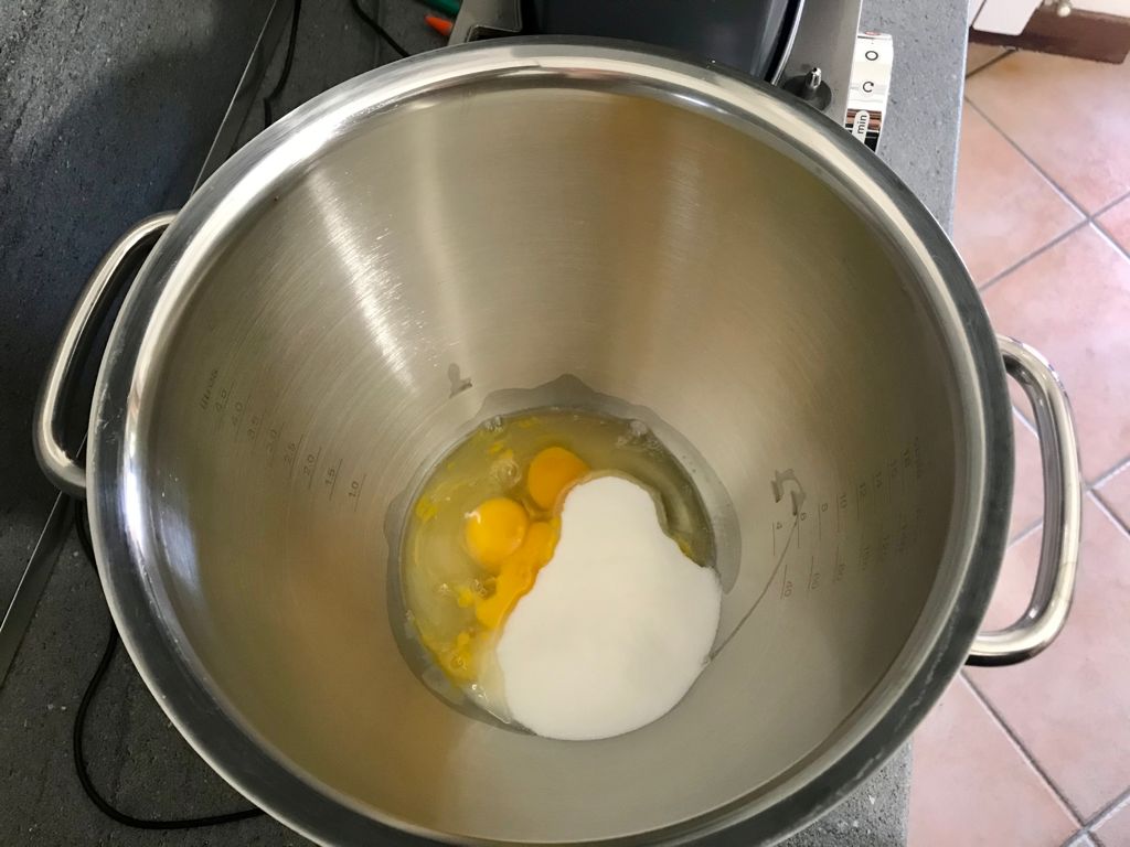 Inseriamo in planetaria le uova con lo zucchero e azioniamo la frusta ad alta velocità.