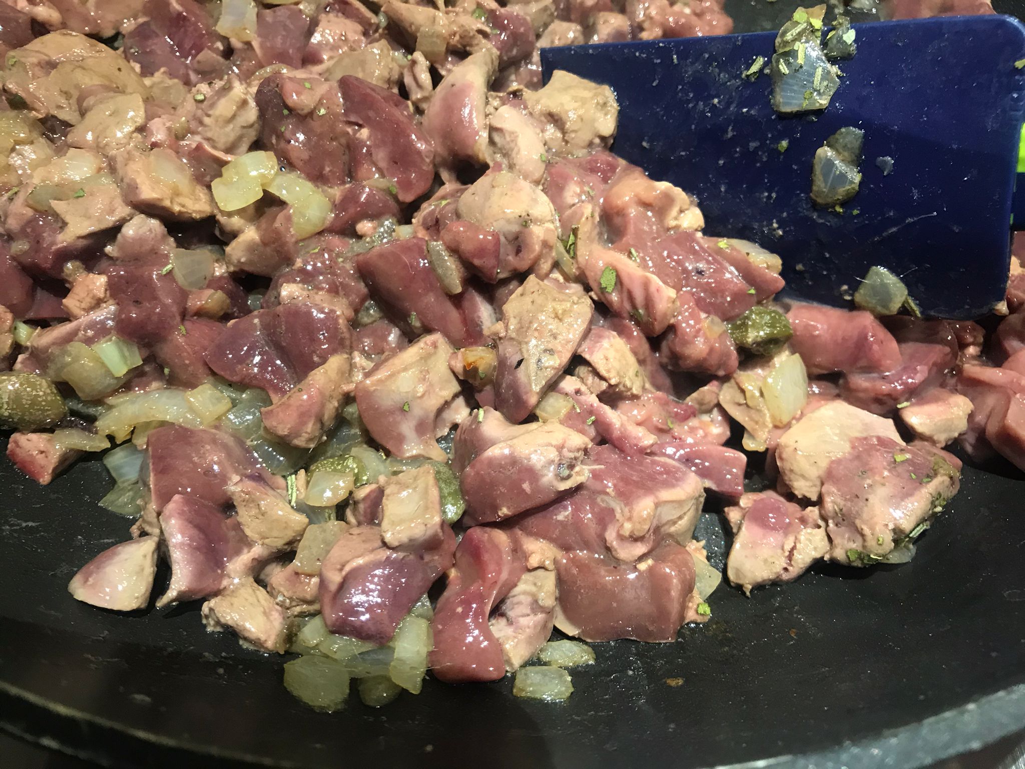 In una padella rosolare le acciughe e la cipolla in un paio di cucchiai di olio evo, aggiungere i capperi e i fegatini e farli rosolare.