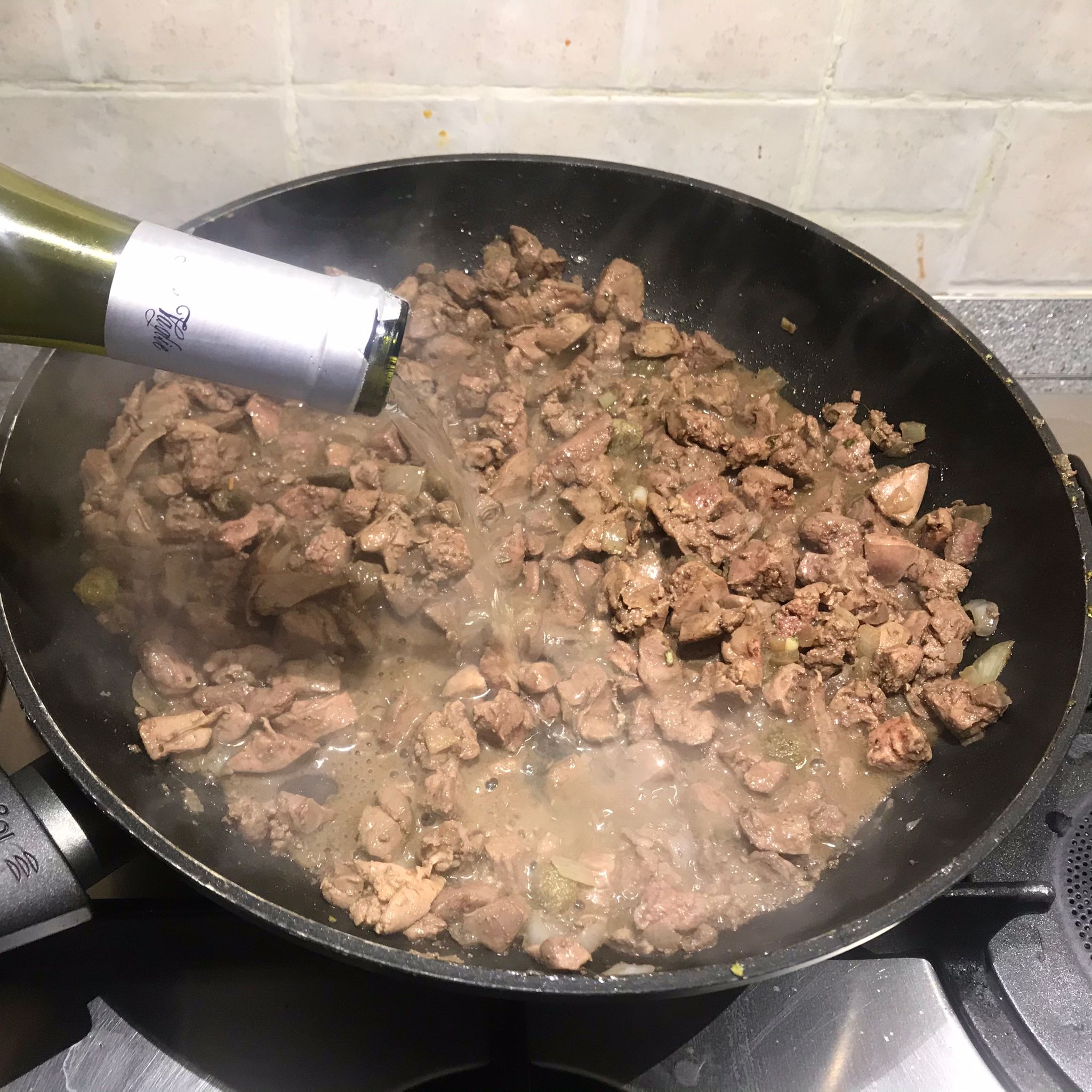 Aggiungere il vino per sfumare e coprire con un coperchio, far cuocere a fuoco medio basso per 10/15 minuti.