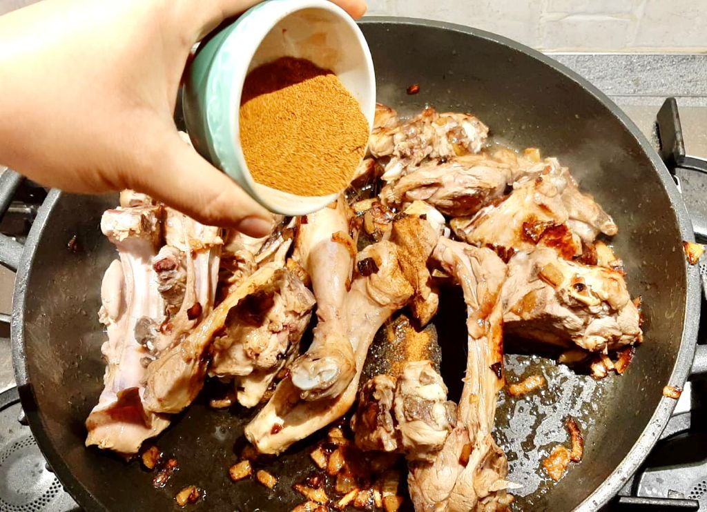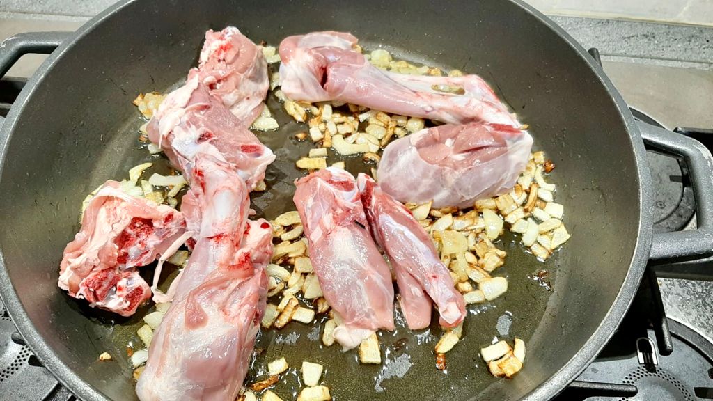 In una pentola antiaderente far scaldare dell’olio d’oliva, aggiungere le cipolle e far rosolare bene, aggiungere la carne e farla sigillare.