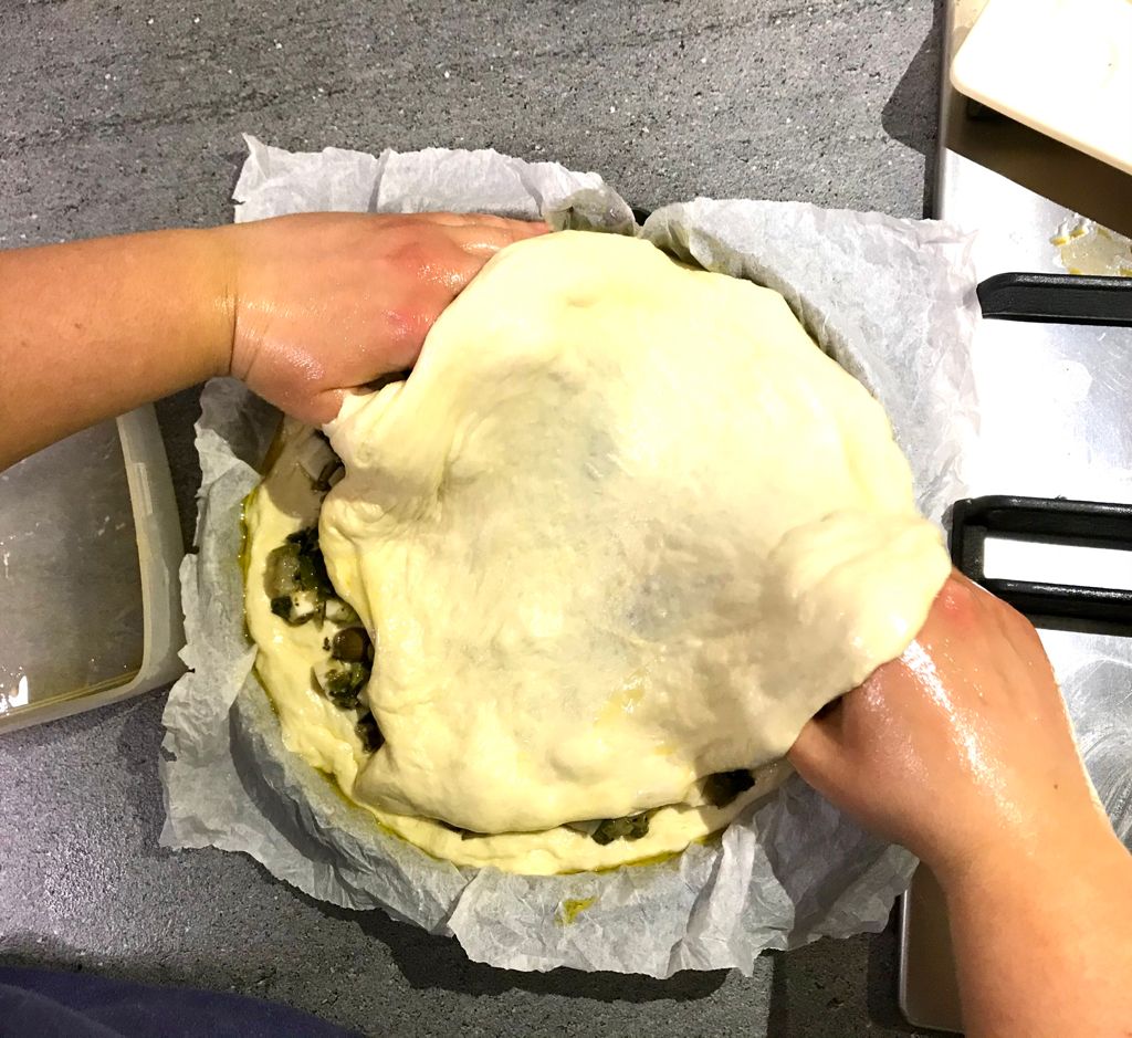 Cercate di allargarlo un po’ e appoggiatelo sopra la farcia, aggiustarlo in modo da coprire tutta la focaccia.