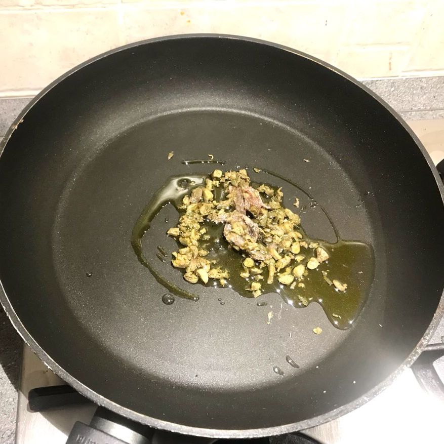 In una padella versare un filo d’olio e le acciughe, farle rosolare finchè saranno sciolte.