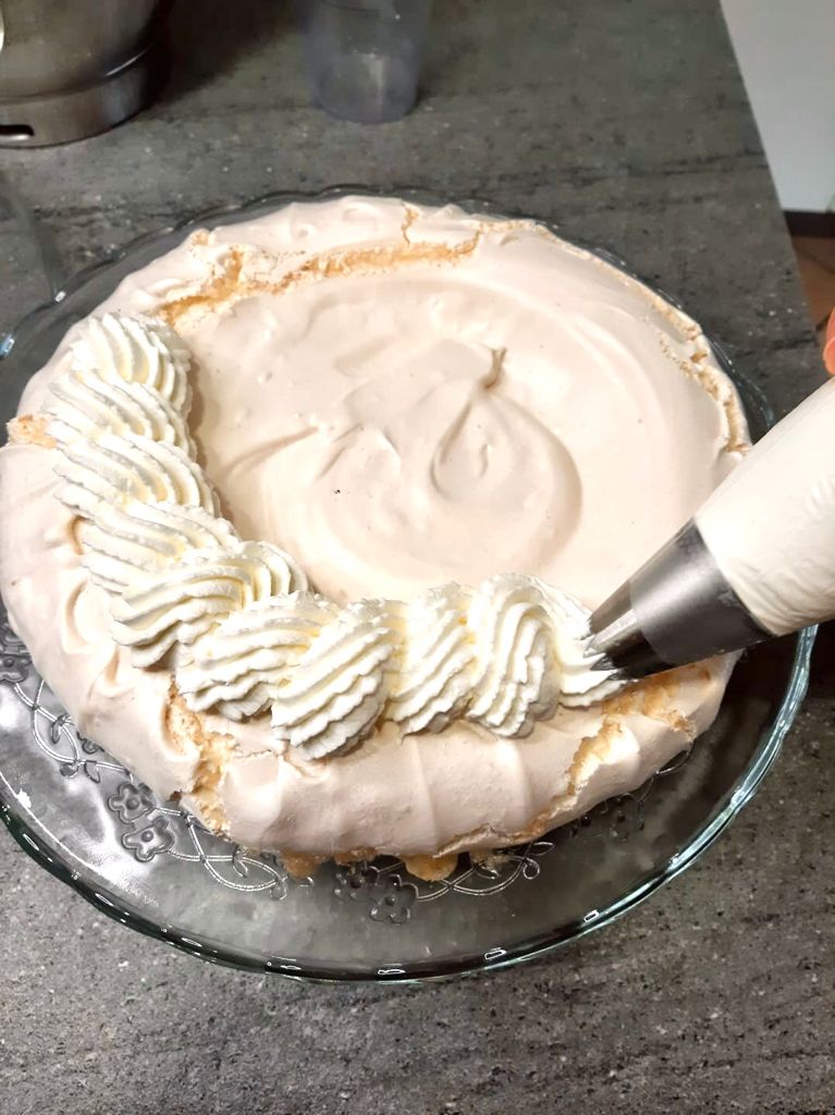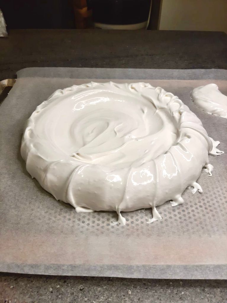 Una volta fredda posizionare il disco di meringa su un piatto da portata (fate attenzione a maneggiarla perché sarà molto delicata.