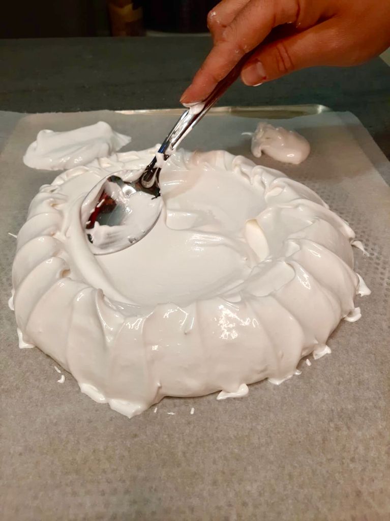 Versare tutta la meringa al centro di una teglia rivestita di carta da forno, con un cucchiaio creare un nido allargando piano piano la meringa fino a creare un disco da circa 22/24 cm.