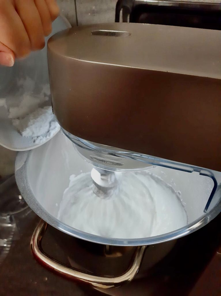 Mettere gli albumi in planetaria con il 10% circa di zucchero, azionare a velocità abbastanza alta, quando inizieranno a schiumare iniziare ad aggiungere il restante zucchero poco per volta e aumentare la velocità al massimo.