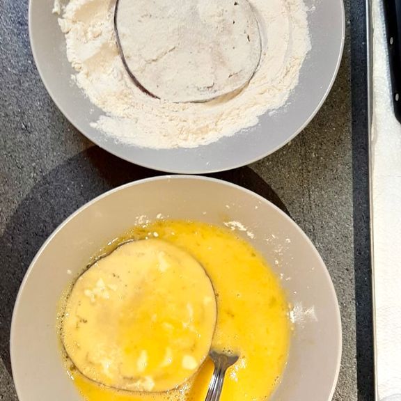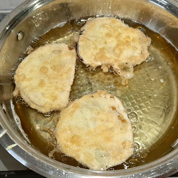 E’ il momento delle melanzane, tagliarle a fette di circa 1/2 cm, passarle nella farina e poi nell’uovo (si avete letto bene, prima farina e poi uovo) e friggere in olio di semi.