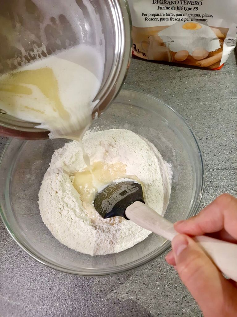 Amalgamare con un cucchiaio in modo che si raffreddi un po’ l’impasto e sarà possibile manovrarlo con le mani.