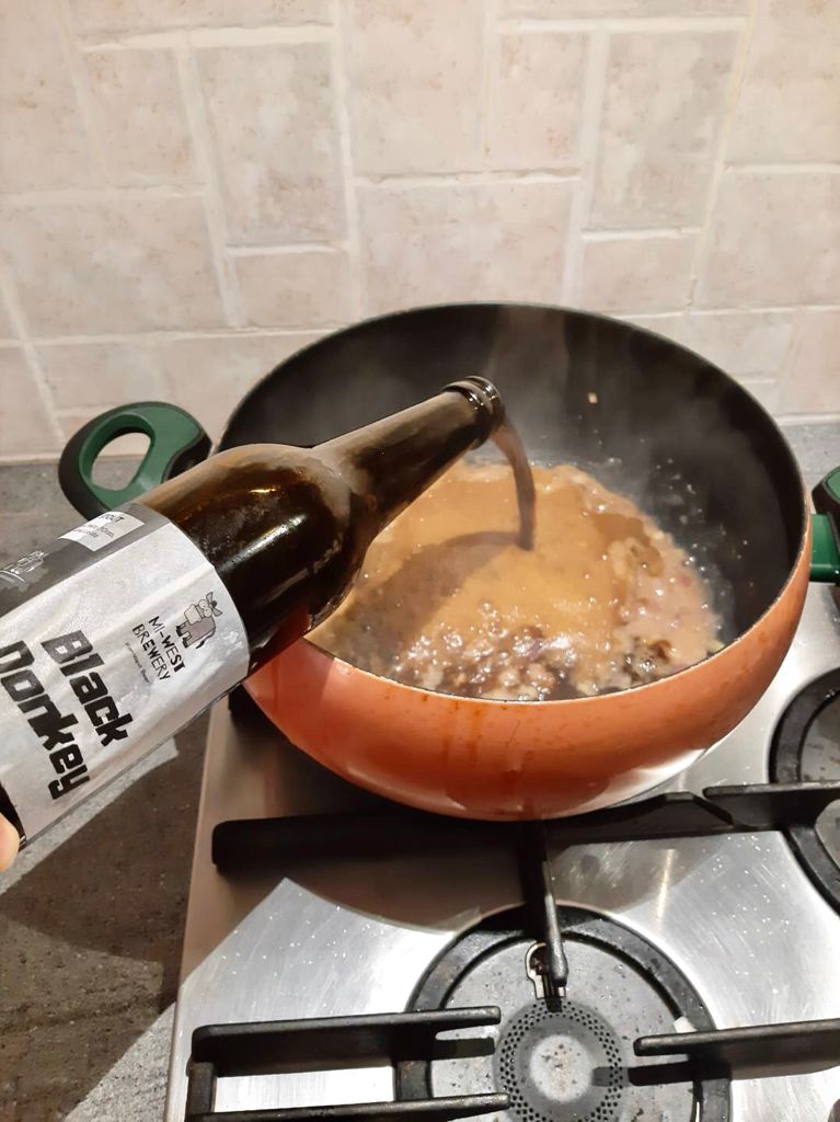 Aggiungere in ordine: la farina e amalgamare bene, il brodo, la birra, il concentrato di pomodoro e la salsa Worcestershire.