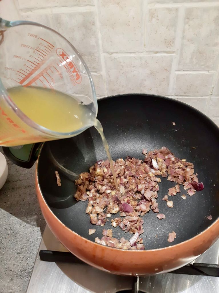 Aggiungere nella stessa padella la cipolla e l’aglio tritato e far rosolare bene.