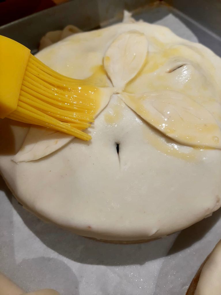 Ritagliare due dischi di pasta sfoglia e coprire le pie, se vi avanza sfoglia usatela per decorare.