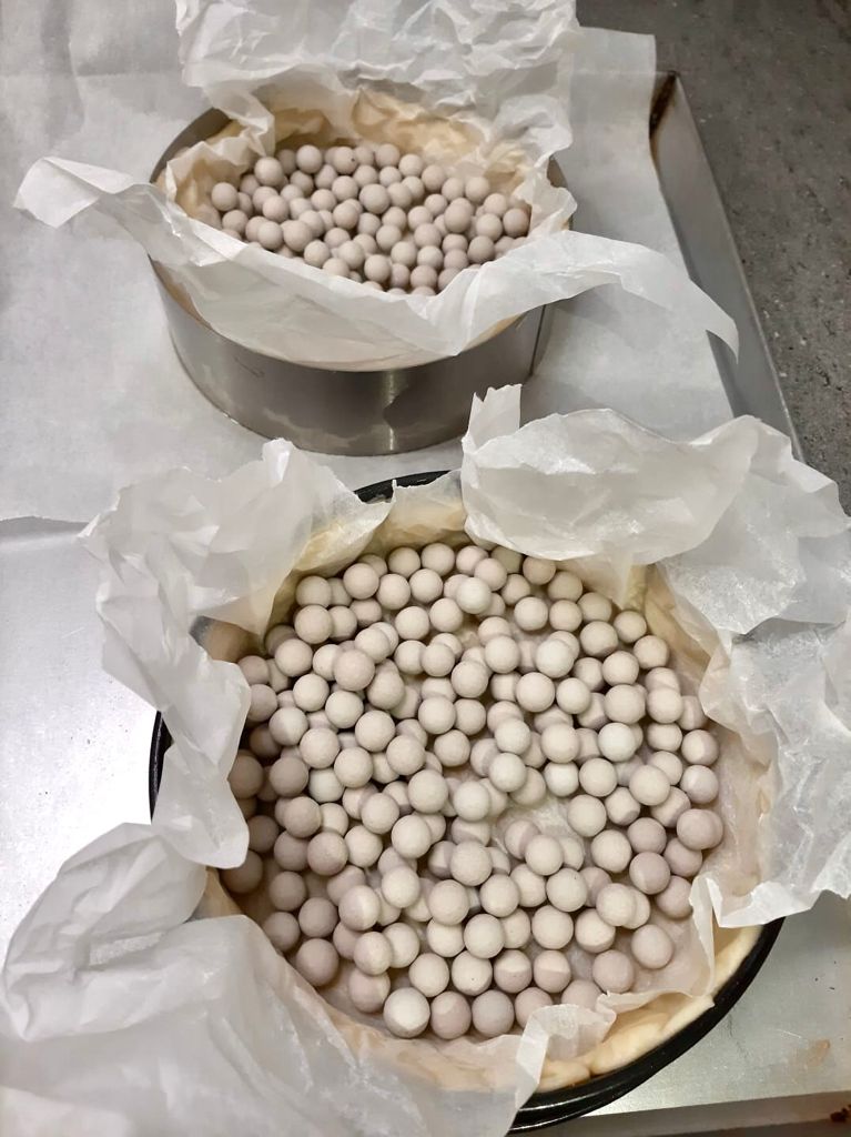 Coprire con della carta da forno e riempire gli stampi con dei fagioli o le biglie in ceramica per non far crescere il guscio in cottura.