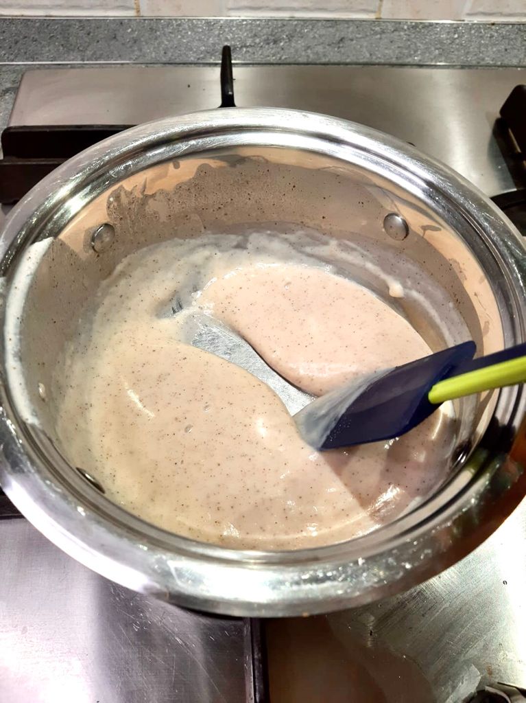 Unire il latte e la pastella in un pentolino e cuocere a fuoco basso finché sarà rassodata, rimuovere la buccia di limone.