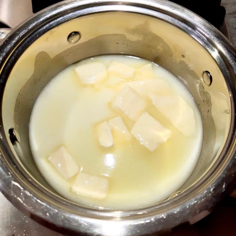 Versare in un pentolino tutti gli ingredienti tranne la farina e le uova, lasciar sciogliere e al primo bollore inserire tutta la farina.