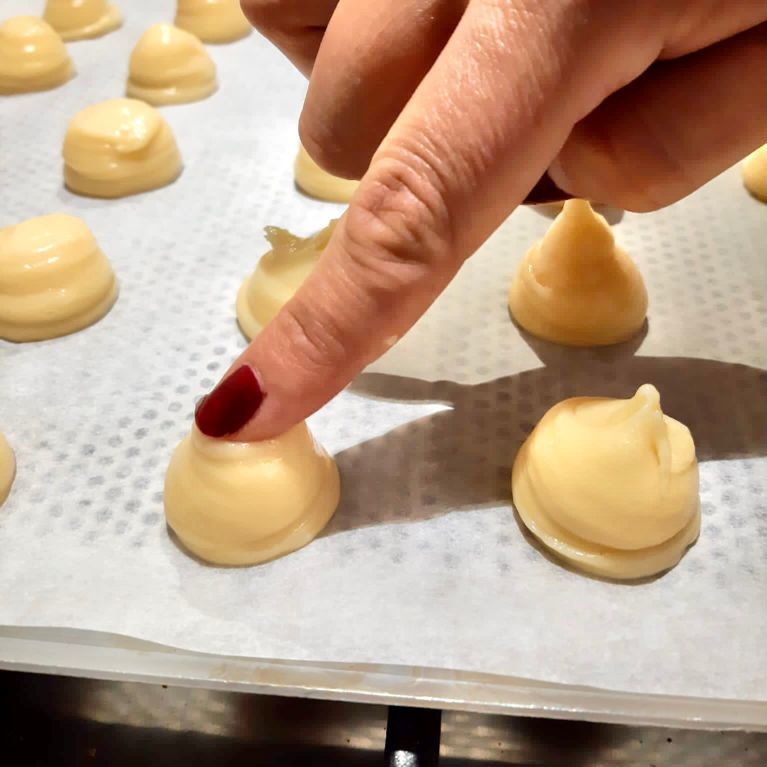 Inumidirsi le dita con dell’acqua e schiacciare delicatamente la superficie del mucchietto di pasta choux, in questo modo si avrà una forma più regolare e l’umidità dell’acqua farà cuocere tutto più uniformemente.