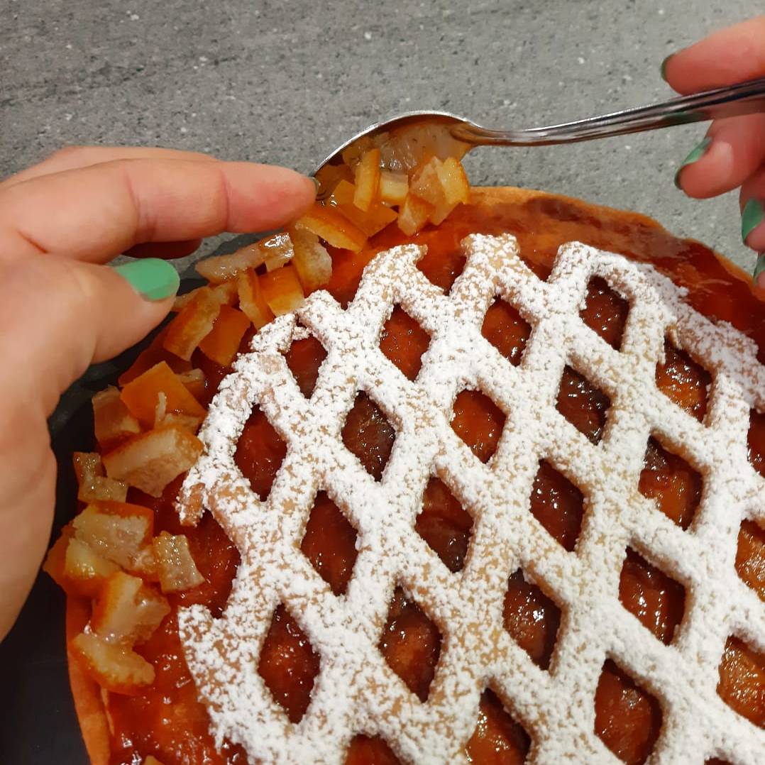 Far raffreddare completamente la torta e lucidarla con uno strato di marmellata di arance, spolverizzare di zucchero a velo la griglia di frolla e poggiarla al centro della torta.
