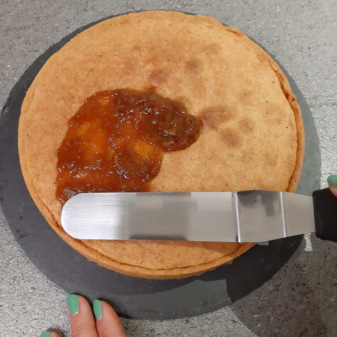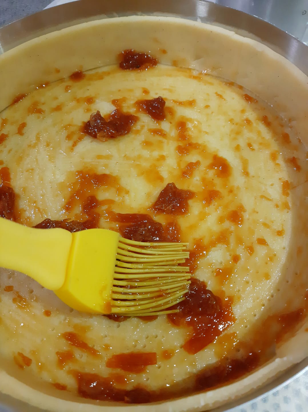 Spennellare la base di frolla della torta con la marmellata di arance, ne serve davvero poca, il suo scopo è di fare da “colla” alla crema frangipane che senza di lei, una volta cotta, tenderebbe a staccarsi.