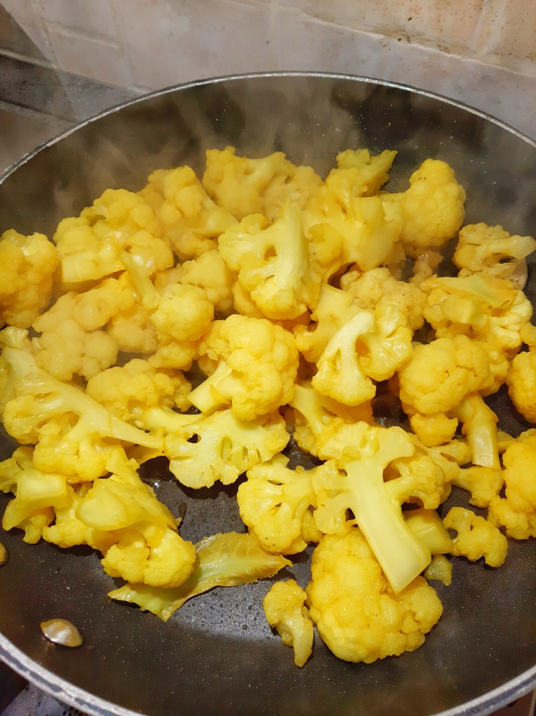 Mettere sul fuoco una pentola piena d’acqua e una volta raggiunto il bollore aggiungere la curcuma, il pepe, il sale e il cavolfiore lavato ridotto a cimette.
