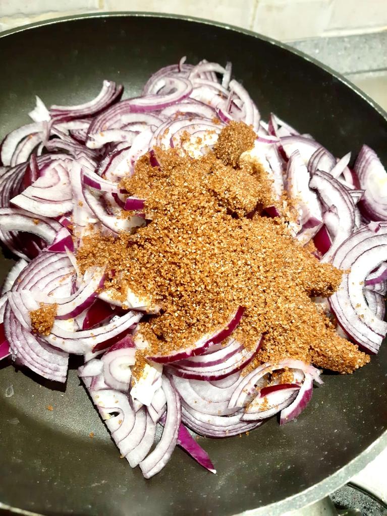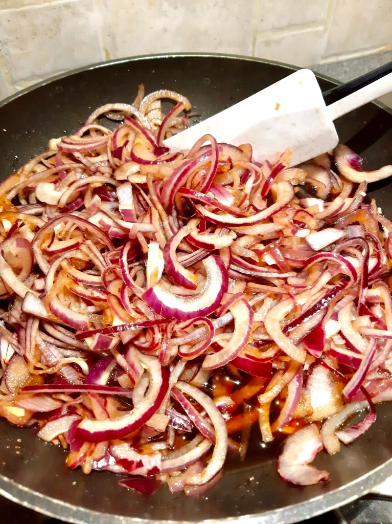 Affettare finemente le cipolle e farle caramellare in padella insieme allo zucchero fino a quando si sarà sciolto completamente. Aggiungere l’aceto e il sale e continuare a cuocere con il coperchio, in questo modo l’umidità che si creerà cuocerà le cipolle ma se dovesse risultare troppo asciutto aggiungete una tazzina di acqua.