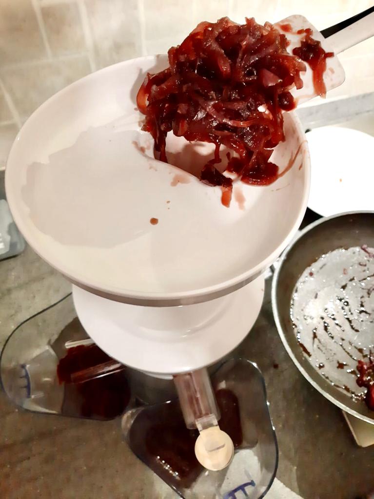 Centrifugare tutto raccogliendo il succo in un pentolino, aggiungere la carragenina k e portare ad ebollizione in modo da far sciogliere tutto bene.