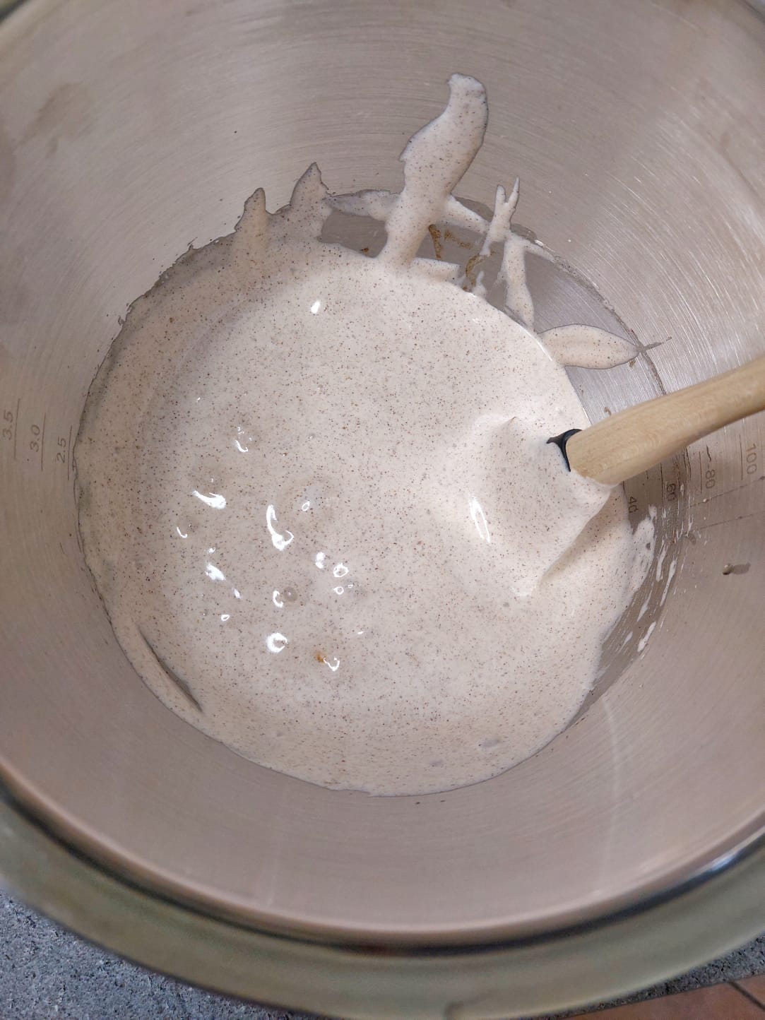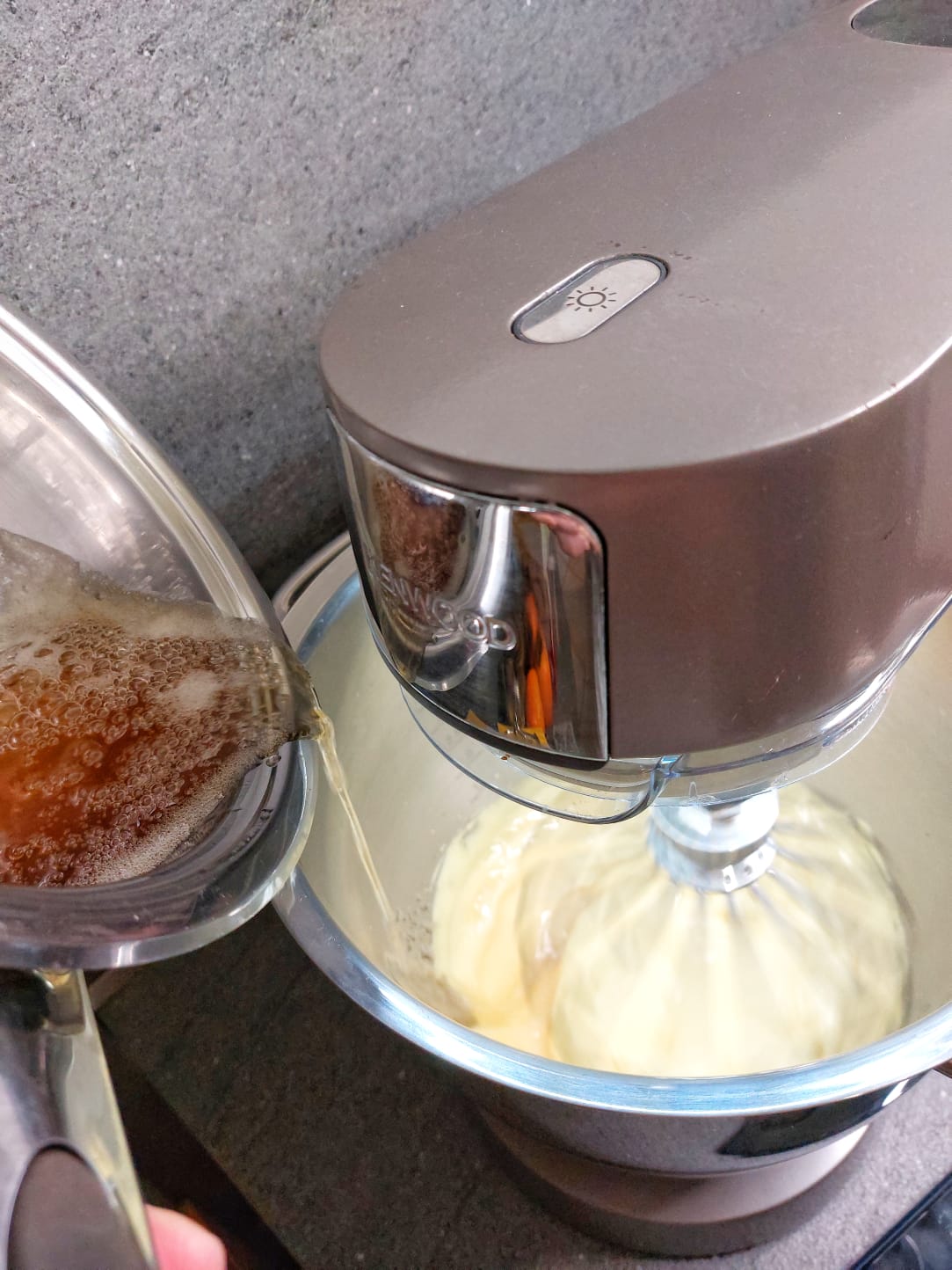 Attenzione! Quando versate il miele bollente, state attenti a non versarlo sulla frusta ma sul bordo della planetaria. In questo modo eviterete schizzi.