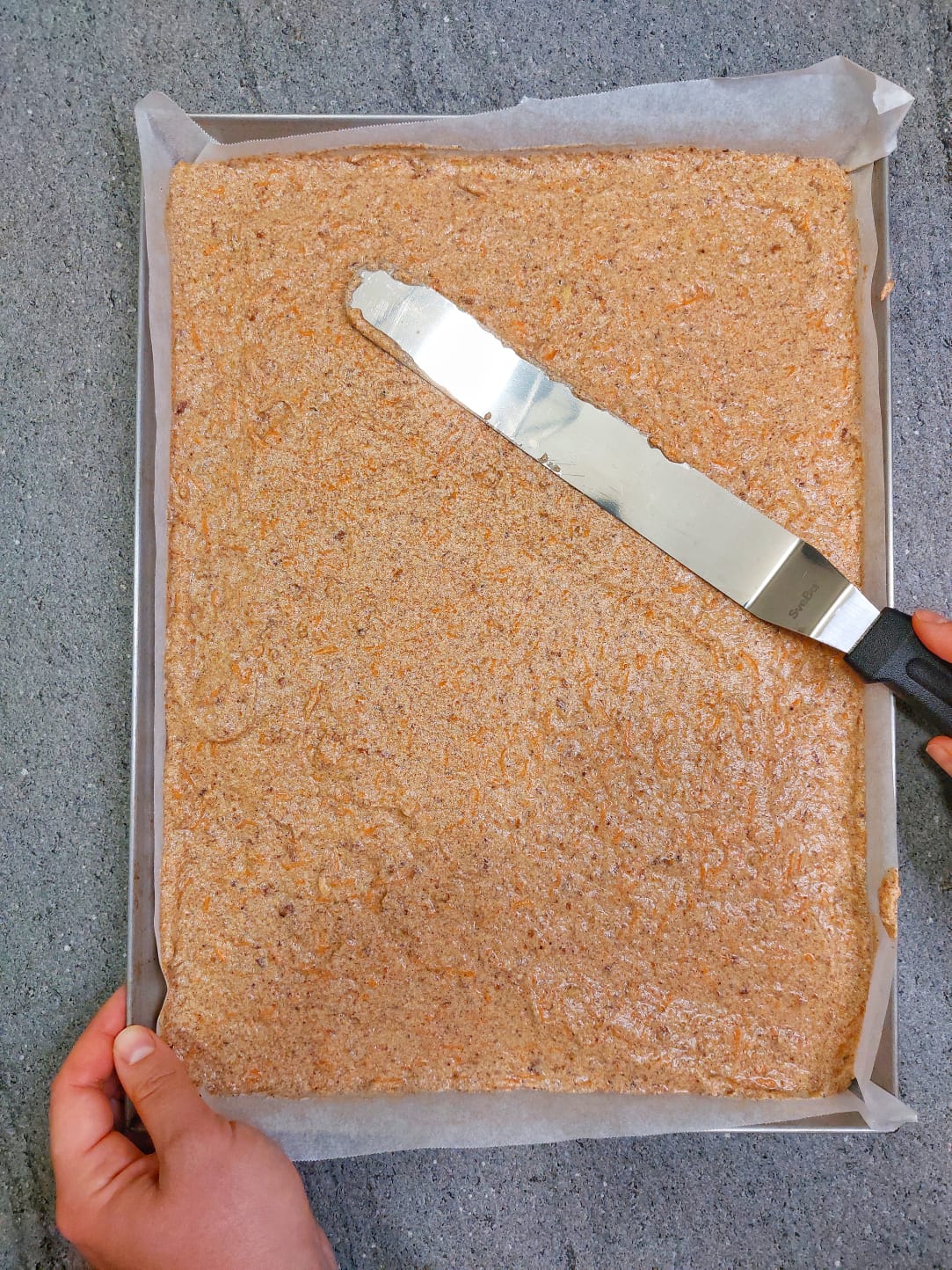 Stendere il composto in una teglia in modo che si crei uno strato spesso circa 1 cm e cuocere in forno ventilato a 180 gradi per 15 minuti circa (fate la prova stecchino, se infilzando il centro della teglia risulterà ancora bagnato lasciate cuocere ancora qualche minuto).